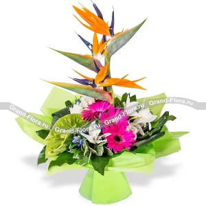 Обворожительный букет с безумно яркими, пылающими герберами. Эти цветы символизируют солнце, улыбку, а также выражают свою симпатию от дарителя. Удачно вписанные хризантемы и листочки зелени создают гармоничный контраст красного с зеленым. Хризантемы олицетворяют открытость, намекая на дружеские чувства и возможно нечто большее. Такой букет подойдет в качестве подарка другу или подруге, он также выразит только зарождающиеся чувства.