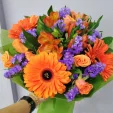 Композиция составлена из ярких оранжевых альстромерий, гербер и роз с непринужденным добавлением фиолетовой статицы.