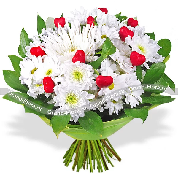 * Обратите внимание: на фото декор в виде сердечек,  в случае отсутствия - возможна замена на гиперикум красный, лагурус или красные колоски.