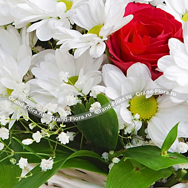 Уменьшенный: роза красная - 1 шт., хризантема кустовая ромашковая (белая) - 4 шт., гипсофила - 1 шт., рускус, оазис, корзина без ручки.