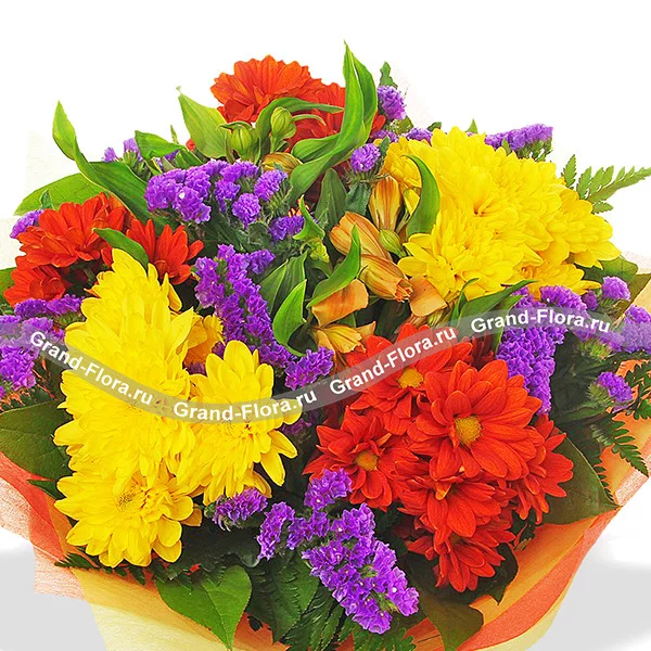 Стандартный: хризантема желтая кустовая - 2 шт., хризантема кустовая оранжевая - 2 шт., альстромерия оранжевая - 2 шт., статица - 4 шт., фетр желто - оранжевый.