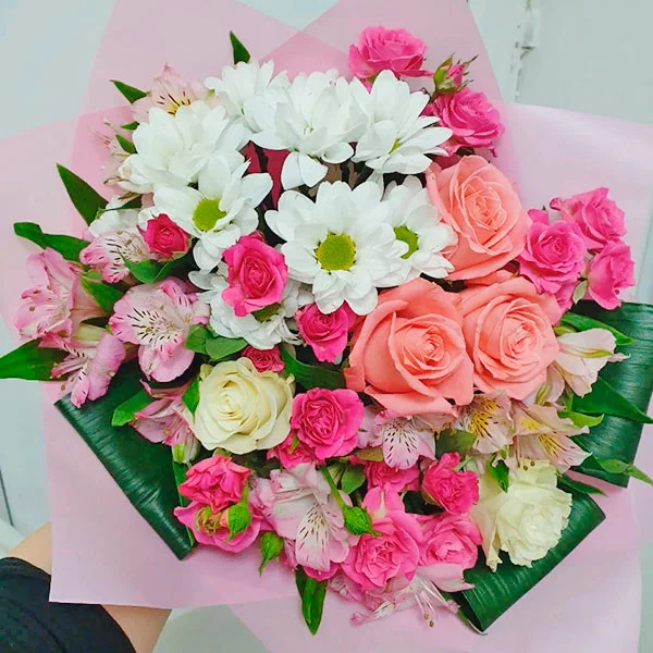 ДЕЛЮКС: роза белая - 4 шт., роза розовая - 5 шт., альстромерия розовая - 3 шт., гербера кремовая - 4 шт., кустовая роза розовая - 3 шт., лист аспидистра - 5 шт., упаковка розовая, лента розовая. Примерный размер: 45Х45 см.