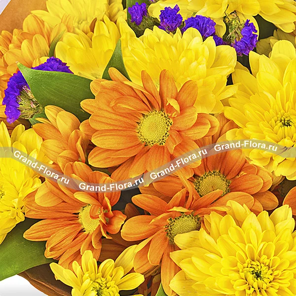 Стандартный: хризантема кустовая жёлтая - 4 шт., хризантема кустовая оранжевая - 3 шт., статица - 3 шт., салал, крафт.