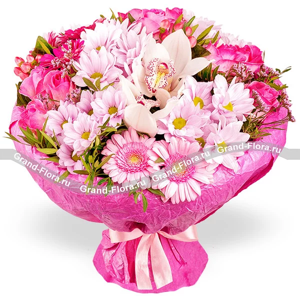 Стандартный: орхидея белая - 1 шт., хризантема кустовая ромашковая розовая - 3 шт., роза розовая - 5 шт., герберы розовые - 2 шт., гиперикум - 2 шт., декоративная зелень, упаковка, лента. Примерный размер: 30Х30 см.