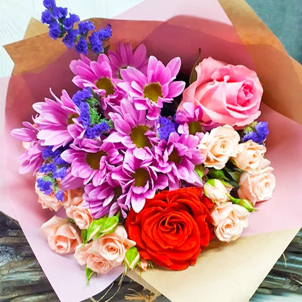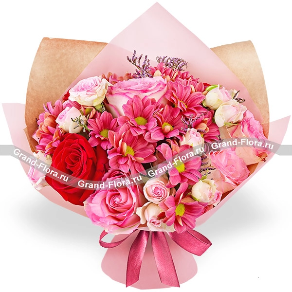 Стандартный: роза красная - 2 шт., роза розовая - 3 шт., кустовая роза розовая - 3 шт., хризантема кустовая розовая - 1 шт., лимониум, упаковка, лента.