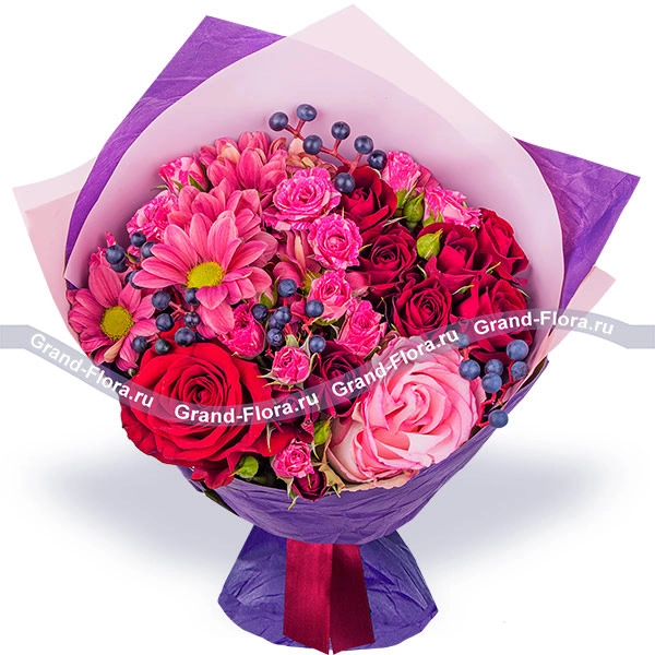 Люкс: роза красная - 5 шт., роза кустовая красная - 4 шт., роза кустовая розовая - 3 шт., хризантема кустовая ромашковая розовая - 3 шт., декор, упаковка, лента. Примерный размер: 40Х40 см.