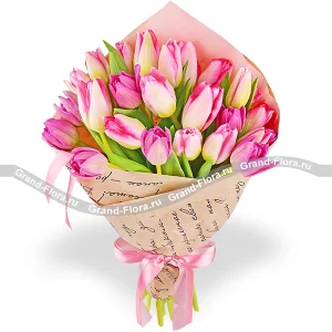 21 тюльпан: разноцветные тюльпаны (фиолетовые, розовые, белые, желтые,красные) - 21 шт., упаковка, лента.