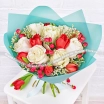 Белые розы Ломоносов, в сочетании с красными тюльпанами ранних сортов, перемешаны с нотами гиперикума и лимониума, в яркой упаковке цвета морской волны и с лентой в тон букету. Диаметр букета от 25 см до 45 см, в зависимости от выбранного Вами варианта букета. Высота букета от 35см. Обращаем Ваше внимание, что состав и оформление букета могут отличаться.
