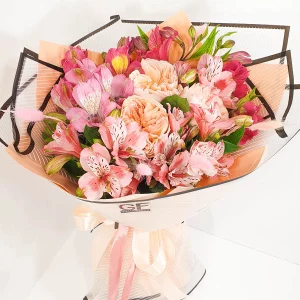 Стандартный: роза красная - 4 шт., роза кустовая розовая - 3 шт., эустома розовая - 2 шт.,гиперикум красный - 1 шт., декоративная зелень., оазис, коробка.