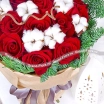 Уменьшенный: роза красная - 5 шт., хлопок белый/светло-розовый- 2 шт., декор, ель, упаковка.