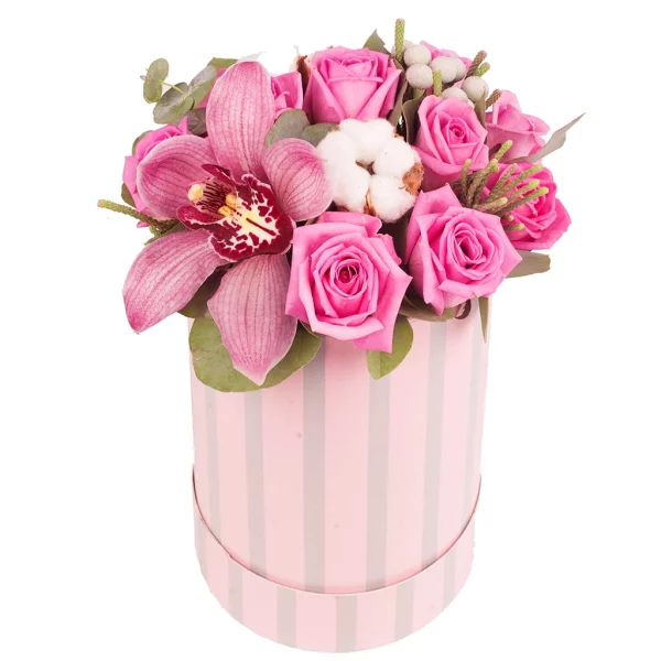 Дыхание марта - коробка с розовыми розами и орхидеей